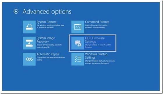 When the menu below appears, select Troubleshoot, then UEFI Firmware Settings.